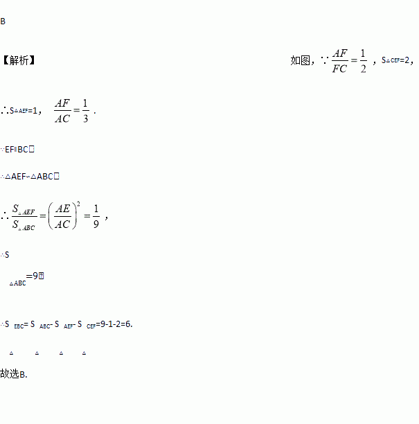 如图,在△ABC中,点E,F分别在边AB,AC上,EF∥BC, ,△CEF的面积为2,则△EBC的面积为( )