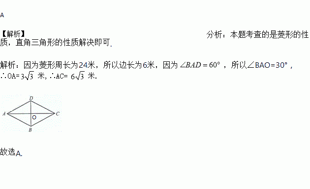 如图,已知某广场菱形花坛ABCD的周长是24米, ,则花坛对角线AC的长等于( )