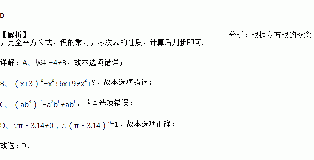 A. =8 B. (x+3)2=x2+9 C. (ab3)2=ab6 D. (π﹣3.14)0=1
