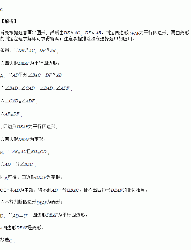 已知DE∥AC、DF∥AB,添加下列条件后,不能判断四边形DEAF为菱形的是( )