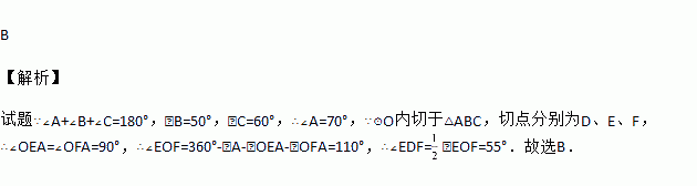 如图1,⊙O内切于△ABC,切点为D,E,F.已知∠B=50°,∠C=60°,连结OE,OF,DE,DF,那么∠EDF等于( )