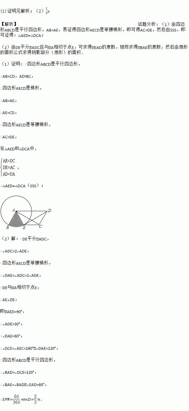 如图,?ABCD中,AB=2,以点A为圆心,AB为半径的圆交边BC于点E,连接DE,AC,AE.