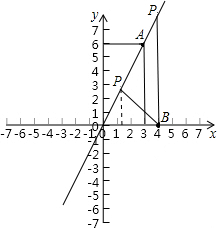 (2)考虑有两种情况:①当∠OBP=90°时,点P的横坐标与点B的横坐标相同,均为4,把x=4代入y=2x,易求y=8,从而可得P点坐标;当∠OPB=90°时,可先设P点坐标是(n,2n),根据勾股定理易得n2+(2n)2+(n-4)2+(2n)2=42,解可求n1=