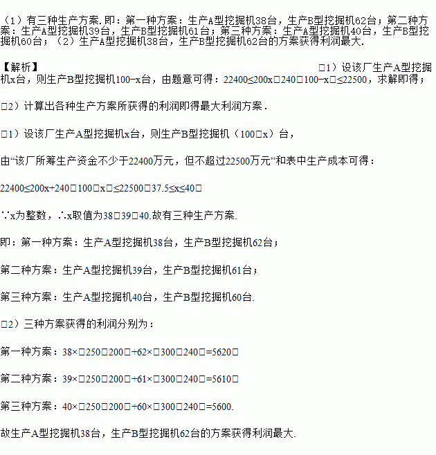 某工程机械厂根据市场需求,计划生产A、B两型号的大型挖掘机共100台,该厂所筹生产资金不少于22400万元,但不超过22500万元,且所筹集的资金全部用于生产此两型号挖掘机,所生产的此两型号挖掘机可全部售出,此两型号挖掘机的生产成本和售价如下表: