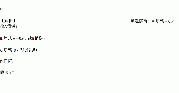 A. 2a×3a=5a B. (﹣2a)3=﹣6a3 C. 6a÷2a=3a D. (﹣a3)2=a6