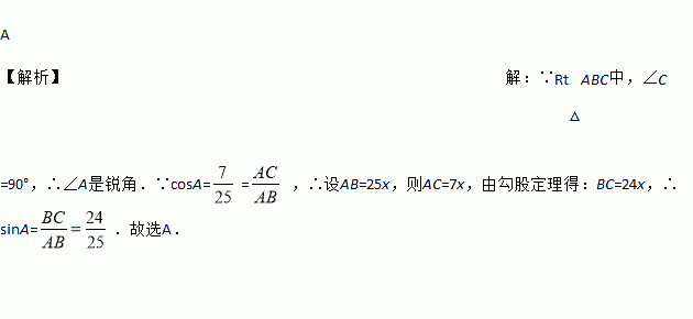 在Rt△ABC中,若∠C=90°,cosA=,则sinA的值为()