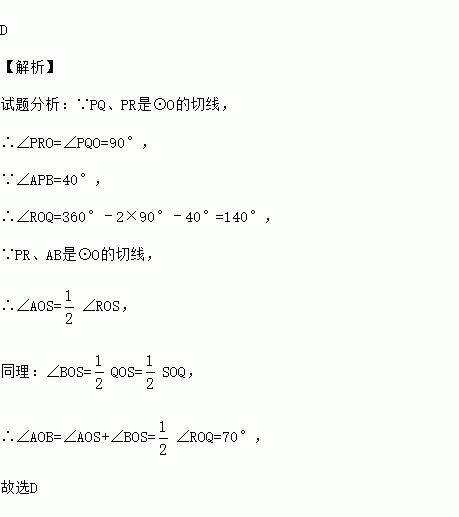 如图,PQ、PR、AB是⊙O的切线,切点分别为Q、R、S,若∠APB=40°,则∠A0B等于( )