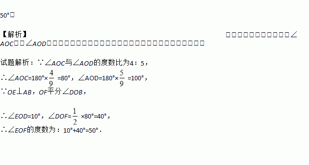 如图,直线AB、CD相交于O点,∠AOC与∠AOD的度数比为4:5,OE⊥AB,OF平分∠DOB,求∠EOF的度数.