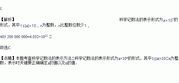 我国研制的“曙光3000服务器”,它的峰值计算速度达到403,200,000,000次/秒,用科学记数法可表示为( )