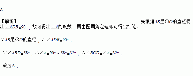 如图,若AB为圆O直径,CD为圆的弦,∠ABD=58°,则∠BCD=()