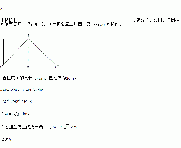 如图,已知圆柱底面的周长为4 dm,圆柱高为2 dm,在圆柱的侧面上,过点A和点C嵌有一圈金属丝,则这圈金属丝的周长最小为( )