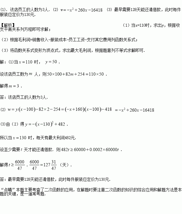 (1)若该店每天的销售价为110元/件时,当天正好收支平衡(其中支出=服装成本+员工工资+应支付其它费用),求该店员工的人数;