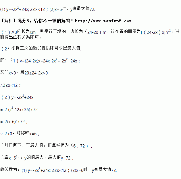如图,有长为24m的篱笆,围成长方形的花圃,且花圃的一边为墙体(墙体的最大可用长度为20m)。