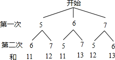 在一个不透明的盒子里有3个分别标有数字5,6,7的小球,它们除数字外均相同,充分摇匀后,先摸出1个球不放回,再摸出1个球,那么这2个球上的数字之和为偶数的概率是________.