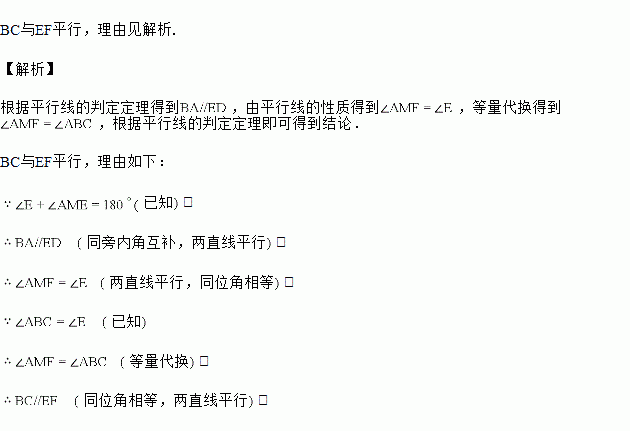如图,已知,,BA、EF相交于点M,试判断BC与EF是否平行,并说明理由.