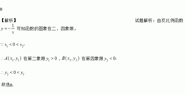 B 【解析】试题解析:由反比例函数可知函数的图象在二、四象限, 在第二象限, 在第四象限 故选B.