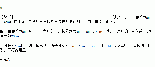 A 【解析】试题分析:分腰长为8cm和4cm两种情况,再利用三角形的三边关系进行判定,再计算周长即可. 【解析】 当腰长为8cm时,则三角形的三边长分别为8cm、8cm、4cm,满足三角形的三边关系,此时周长为20cm; 当腰长为4cm时,则三角形的三边长分别为4cm、4cm、8cm,此时4+4=8,不满足三角形的三边关系,不符合题意; 故选A.