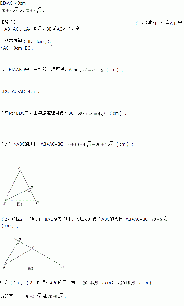 △ABC是等腰三角形,腰上的高为8cm,面积为40cm2,则该三角形的周长是_______cm.