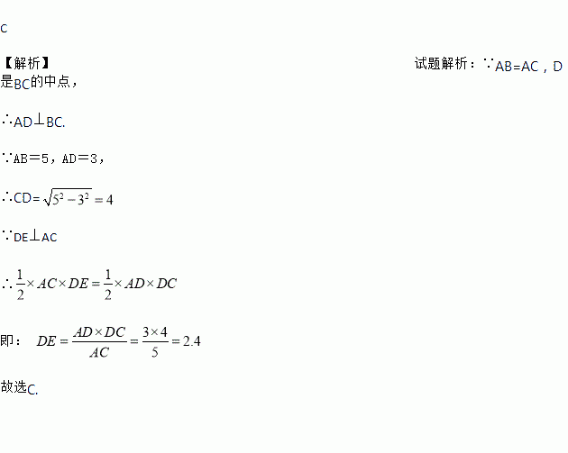 如图,△ABC中,AB=AC,D为BC的中点,DE⊥AC于点E,已知AB=5,AD=3,则DE的长为( )