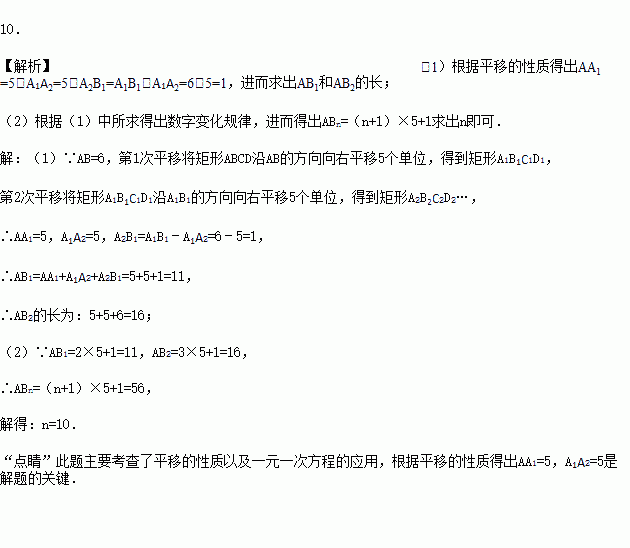如图,长方形ABCD中,AB=6,第一次平移长方形ABCD沿AB的方向向右平移5个单位,得到长方形A1B1C1D1,第2次平移将长方形A1B1C1D1沿A1B1的方向向右平移5个单位,得到长方形A2B2C2D2…,第n次平移将长方形An﹣1Bn﹣1Cn﹣1Dn﹣1沿An﹣1Bn﹣1的方向平移5个单位,得到长方形AnBnCnDn(n>2),若ABn的长度为56,则n=______.