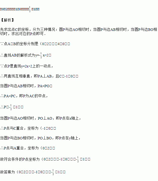如图,在平面直角坐标系中,点A、B的坐标分别是(0,2)、(4,0),点P是直线y=2x+2上的一动点,当以P为圆心,PO为半径的圆与△AOB的一条边所在直线相切时,点P的坐标为__________.