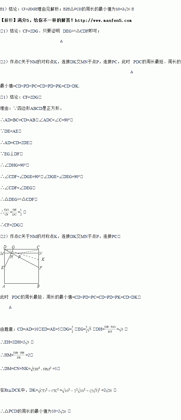 (2)过点H作MN∥CD,分别交AD,BC于点M,N,若正方形ABCD的边长为10,点P是MN上一点,求△PDC周长的最小值.