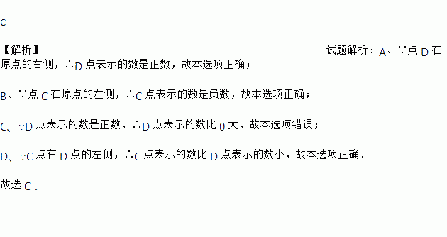C 【解析】试题解析:A、∵点 D 在原点的右侧,∴D 点表示的数是正数,故本选项正确; B、∵点 C 在原点的左侧,∴C 点表示的数是负数,故本选项正确; C、∵D 点表示的数是正数,∴D 点表示的数比 0 大,故本选项错误; D、∵C 点在 D 点的左侧,∴C 点表示的数比 D 点表示的数小,故本选项正确. 故选 C.