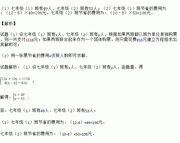 某校七年级(1)、(2)两班计划去游览该景点,其中(1)班人数少于50人,(2)班人数多于50人且少于100人,如果两班都以班为单位单独购票,则一共支付1118元;如果两班联合起来作为一个团体购票,则只需花费816元.