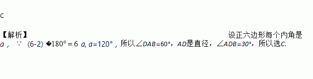 如图所示,正六边形ABCDEF内接于⊙O,则∠ADB的度数是().