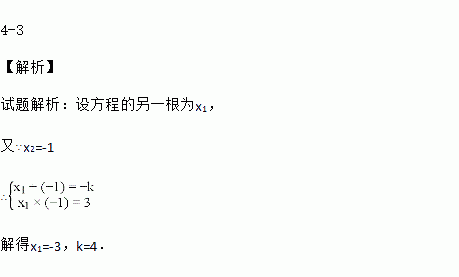 如果关于x的方程x2+kx+3=0有一个根是-1,那么k=________,另一根为______.