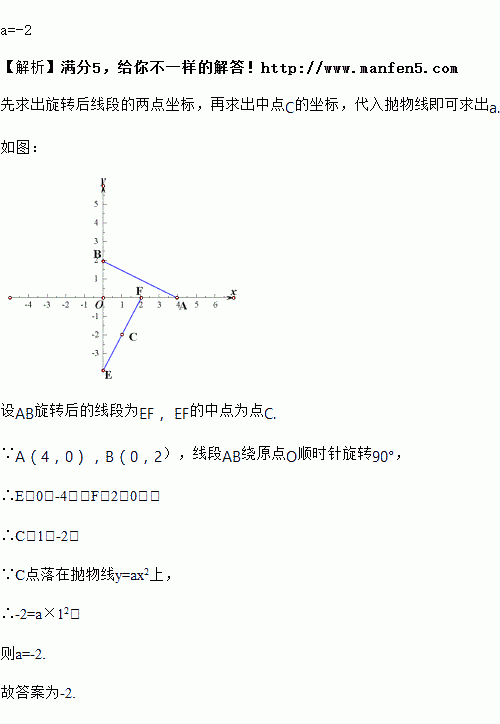 如图,A(4,0),B(0,2),将线段AB绕原点O顺时针旋转90°,线段AB的中点C恰好落在抛物线y=ax2上,则a=_____.