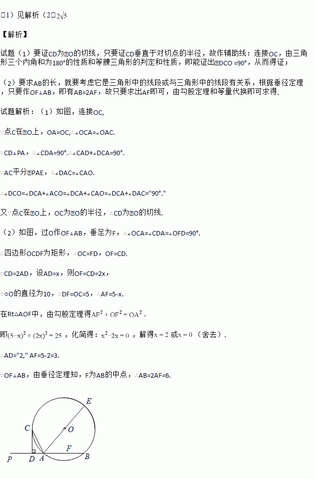 如图,已知直线PA交⊙O于A、B两点,AE是⊙O的直径,点C为⊙O上一点,且AC平分∠PAE,过C作CD⊥PA,垂足为D.