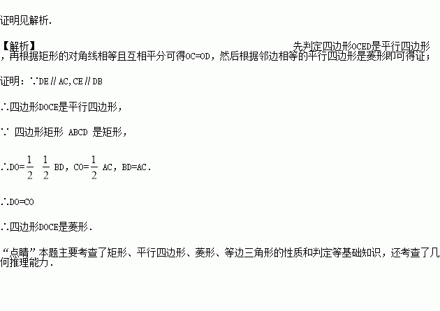 如图,在矩形ABCD 中,对角线 AC,BD 相交于点O,DE∥AC,CE∥DB,CE、DE 相交于点E .求证:四边形 DOCE 是菱形.