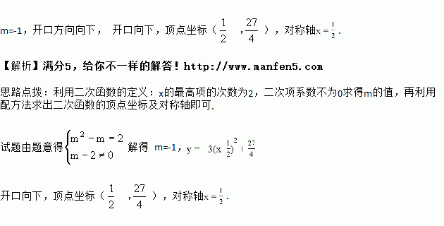 已知是二次函数,求m的值,并判断此抛物线开口方向,写出顶点坐标及对称轴.