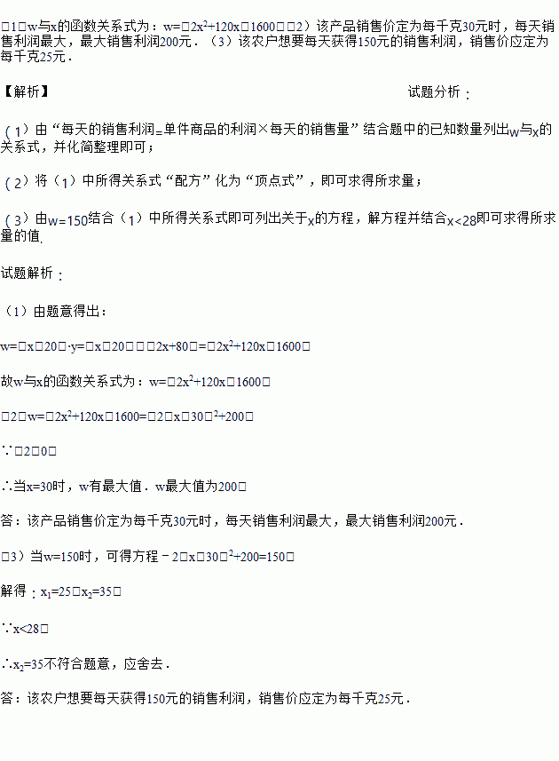 (3)如果物价部门规定这种产品的销售价不高于每千克28元,该农户想要每天获得150元的销售利润,销售价应定为每千克多少元?
