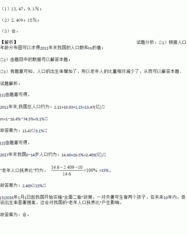 £¨2£©Èô°´Ä¿Ç°ÎÒ¹úµÄÈË¿Ú×ÔÈ»Ôö³¤ÂÊÍÆ²â£¬µ½2027ÄêÄ©ÎÒ¹úÔ¼ÓÐ14.60ÒÚÈË¡£¼ÙÉè0-14ËêÈË¿ÚÕ¼×ÜÈ˿ڵİٷֱÈÒ»Ö±Îȶ¨ÔÚ16.5£¥£¬15-64ËêµÄÈË¿ÚÒ»Ö±Îȶ¨ÔÚ10ÒÚ£¬ÄÇô2027ÄêÄ©ÎÒ¹ú0-14ËêÈË¿ÚԼΪ_______ÒÚ£¬¡°ÀÏÄêÈ˿ڸ§Ñø±È¡±Ô¼Îª_______£» £¨¾«È·µ½1£¥£©