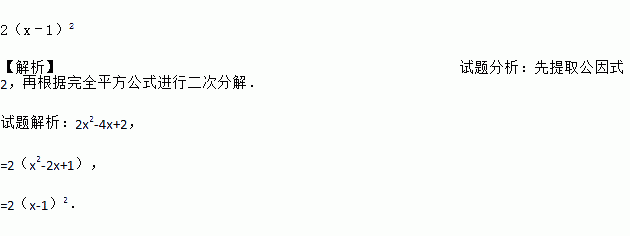 2(x﹣1)2 【解析】试题分析:先提取公因式2,再根据完全平方公式进行二次分解. 试题解析:2x2-4x+2, =2(x2-2x+1), =2(x-1)2.