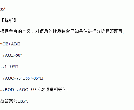 已知直线AB和CD相交于O点,OE⊥AB,∠1=55°,则∠BOD=_____度.