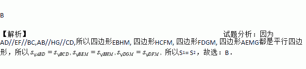 如图,过平行四边形ABCD的对角线BD上一点M分别作平行四边形两边的平行线EF与GH,那么图中的平行四边形AEMG的面积S1与平行四边形HCFM的面积S2的大小关系是( )
