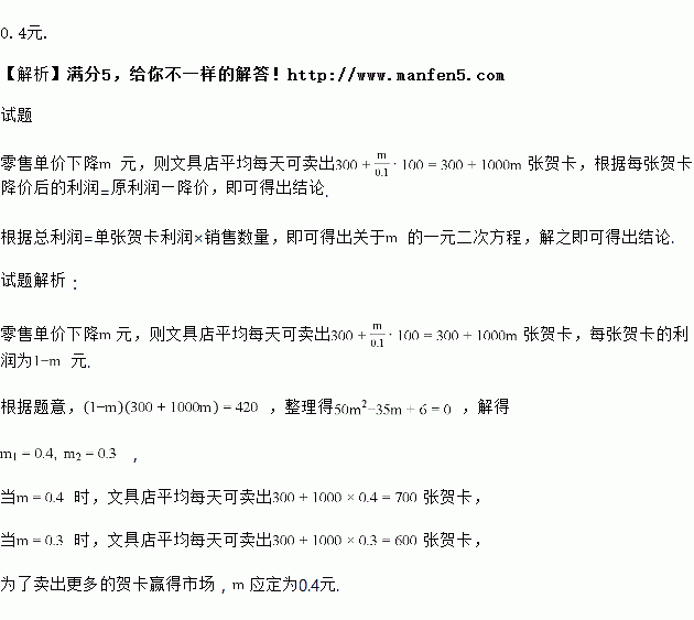 (2)在不考虑其他因素的条件下,该店希望每天卖贺卡获得的利润是420元,并且能卖出更多的贺卡赢得市场,