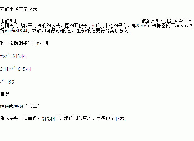 要种一块面积为615.44的圆形草地以美化家庭,它的半径应是多少米?(π取3.14)
