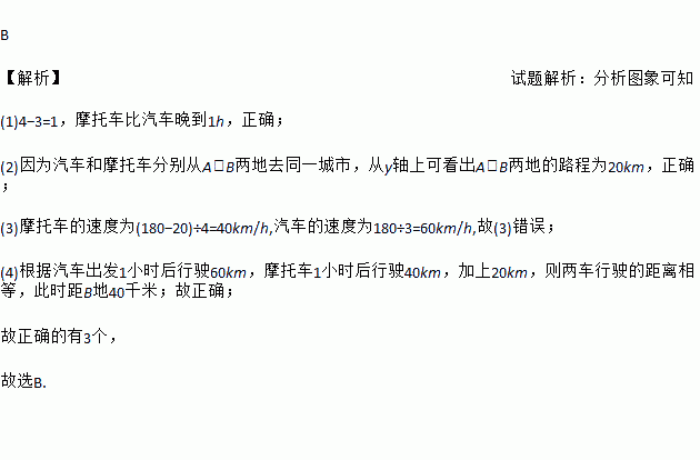 B 【解析】试题解析:分析图象可知 (1)4?3=1,摩托车比汽车晚到1h,正确; (2)因为汽车和摩托车分别从A,B两地去同一城市,从y轴上可看出A,B两地的路程为20km,正确; (3)摩托车的速度为(180?20)÷4=40km/h,汽车的速度为180÷3=60km/h,故(3)错误; (4)根据汽车出发1小时后行驶60km,摩托车1小时后行驶40km,加上20...