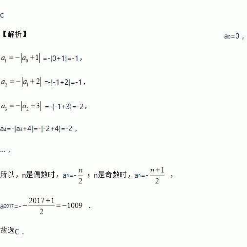 C 【解析】a0=0, =-|0+1|=-1, =-|-1+2|=-1, =-|-1+3|=-2, a4=-|a3+4|=-|-2+4|=-2, …, 所以,n是偶数时,an=-;n是奇数时,an=- , a2017=- . 故选C.