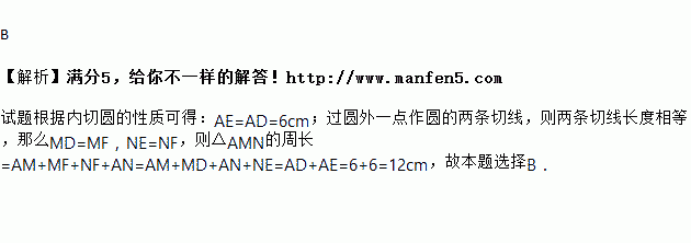 如图,△ABC是一张三角形纸片,⊙O是它的内切圆,点D、E是其中的两个切点,已知AD=6cm,小明准备用剪刀沿着与⊙O相切的一条直线MN剪下一块三角形(△AMN),则剪下的△AMN的周长是( )