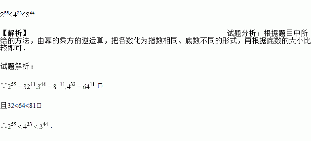255<433<344 【解析】试题分析:根据题目中所给的方法,由幂的乘方的逆运算,把各数化为指数相同、底数不同的形式,再根据底数的大小比较即可. 试题解析: ∵, 且32<64<81, ∴.