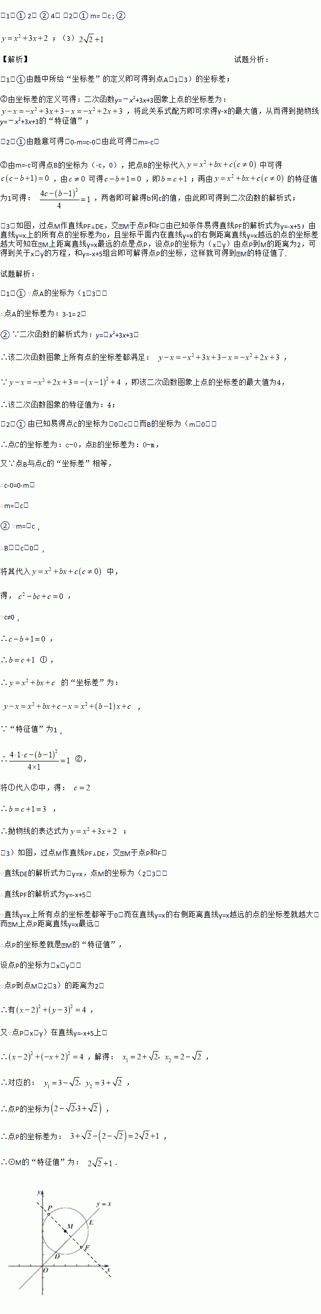 (3)如图,在平面直角坐标系xOy中,以M(2,3)为圆心,2为半径的圆与直线y=x相交于点D、E请直接写出⊙M的“特征值”为 。