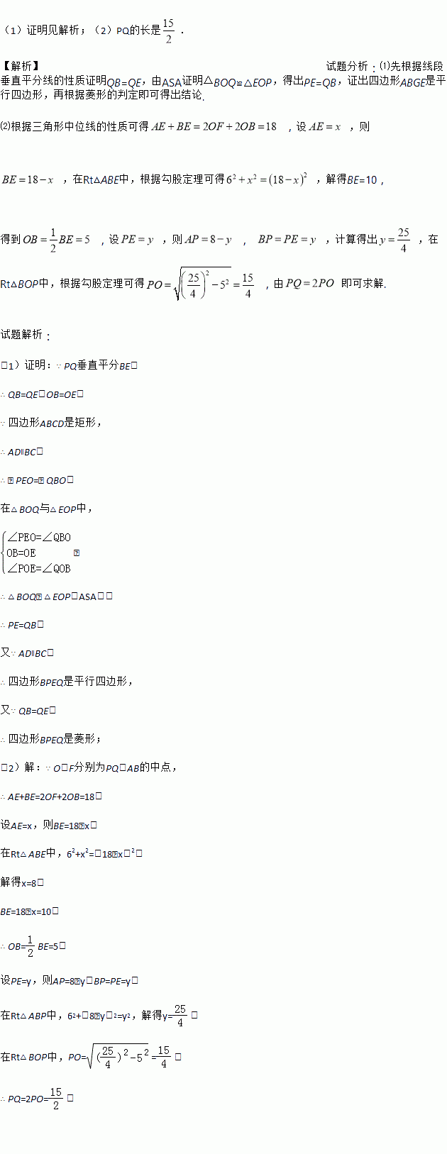 如图,在矩形ABCD中,E是AD上一点,PQ垂直平分BE,分别交AD、BE、BC于点P、O、Q,连接BP、EQ.