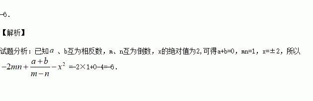 已知、b互为相反数,m、n互为倒数,x的绝对值为2 ,则=______。