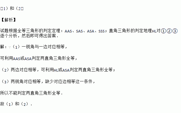 判定两直角三角形全等的各种条件:(1)一锐角和一边对应相等(2)两边对应相等(3)两锐角对应相等.其中能得到两个直角三角形全等的条件是________ .