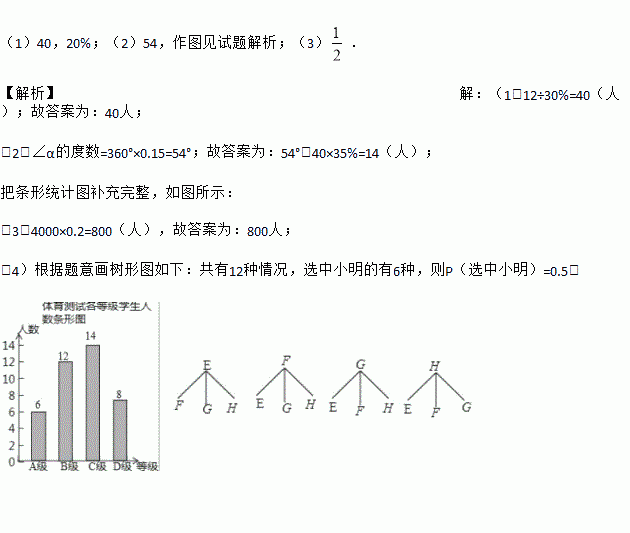 (4)测试老师想从4位同学(分别记为E、F、G、H,其中E为小明)中随机选择两位同学了解平时训练情况,请用列表或画树形图的方法求出选中小明的概率.